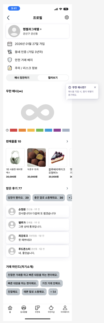 프로필창 임을 맨상단에 알려주면서 바로 밑에 프로필 상세 설명을 배치했다. 프로필 상세 설명란에 가입 날짜, 동네 인증, 안전 거래 배지, 주의 / 리스크 정보를 넣어 판매자의 신뢰 정보를 담았다.