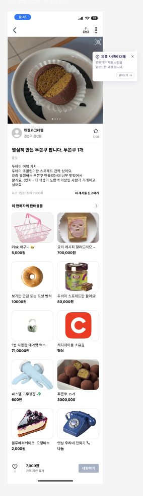 아래는 제품 상세 설명 화면(구매자가 찾아간 판매자의 게시글)이다. 판매자가 팔고자 하는 제품 사진을 메인으로 보일 수 있게 배치했다. 사진 맨오른쪽 상단에 카메라 아이콘을 추가했다. 판매자가 원하는 대로 사진을 찍어올려도 되지만 신규유저나 판매를 잘 안해본 유저라면 어떤 사진을 찍어야 하는지 쉽지 않다. 또한, 구매자 입장에서 원하는 제품 사진들이 있을 것이다. 데이터 분석하에 가장 도움을 많이 얻은 사진 구도나 설정을 판매자에게 먼저 제시하여(체크리스트로 보여주기) 그에 따라 판매자가 사진을 찍고 난 후, 체크리스트를 하면 자동으로 툴팁의 살펴보기 페이지에 기록된다. 이후에, 구매자는 살펴보기 페이지로 넘어가서 판매자가 어떤 의도를 가지고 사진을 첨부했는지 유추하지 않아도 알 수 있다. 그리고 툴팁으로 배치한건 추가설명이기에 구매자가 읽는 것에 선택권을 주고 싶었다.(시간이 없고 빠른 구매를 원하는 구매자들에게 스크롤되는 개수 줄여주기)
