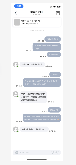 아래는 거래 요청 화면 (대화창)이다. 맨상단에 판매자 닉네임을 표시하여 구매자입장에서 판매자의 채팅창임을 바로 인지시켜주었다. 또한 구매자가 사고자 하는 물품의 타이틀과 가격을 외우거나 게시글로 찾아가서 확인하지 않아도 되는 설명을 닉네임바 바로 하단에 배치했다.